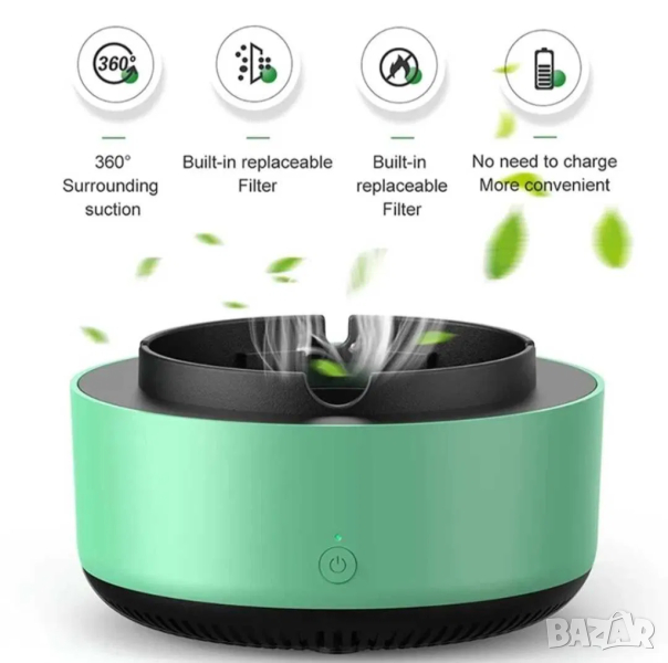 Пепелник за пречистване на въздуха, който филтрира цигарения дим и елиминира неприятните миризми чрез голямата 360-градусова пръстеновидна всмукателна технология, която естествено освобождава отрицателни йони.