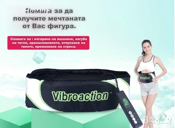 След като сте решили как да се храните, може да се отпуснете на дивана, а вибриращият колан за отслабване Vibroaction ще се погрижи за останалото. Благодарение на неговото действие ще получите тонизирани мускули и самочувствие. Той действа на принципа на вибрациите. Резултатът е подобрено кръвообращение, разбиване на мастните клетки, изглаждане на целулита и постепенно намалява на обиколките. Виброколанът може да се ползва във всяка област: седалище, корем, гръб и където решите. Нужни са ви само 10 минути дневно.