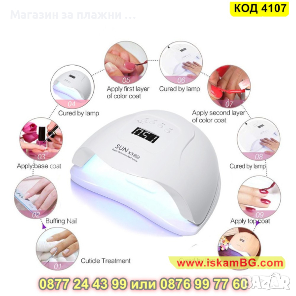 Лампата SUN 5 (110W LED+UV) е предназначена за полимеризация на гел лакове (шеллак), удължаване на нокти и всякакви покрития, които съдържат гел (напр. биогел).