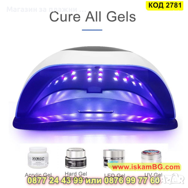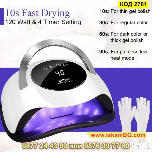 – Време за сушене гел лак – 10 секуди. Гел полимеризация – 30 секунди, лампата работи с всички гелове и гел лакове.