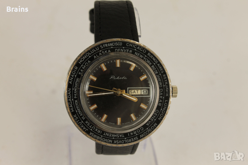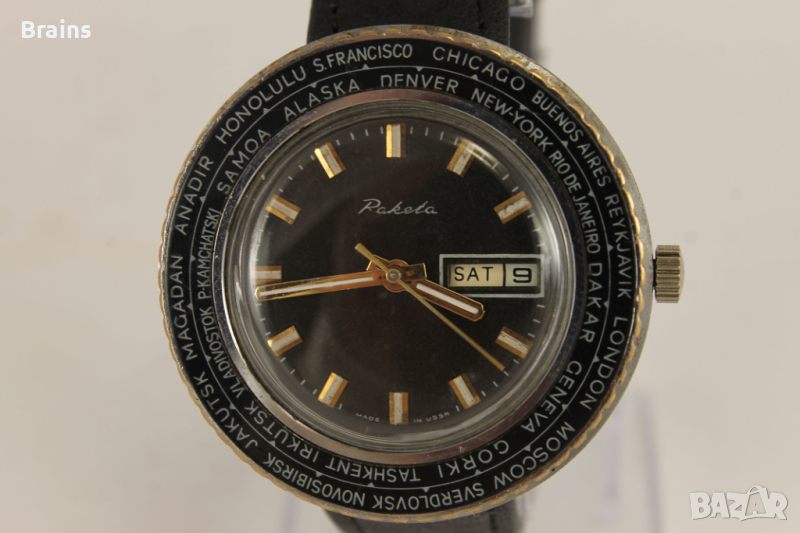 Рядък колекцонерски Руски часовник Ракета световно време. Машината е калибър 2628HAсъс 17 камъка, отлично работеща, календара работи нормално.