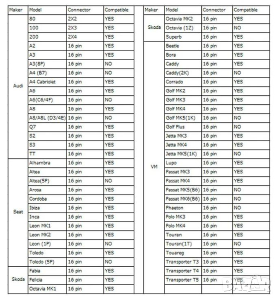 Съвместими марки автомобили: Volkswagen, Audi, Skoda, Seat: