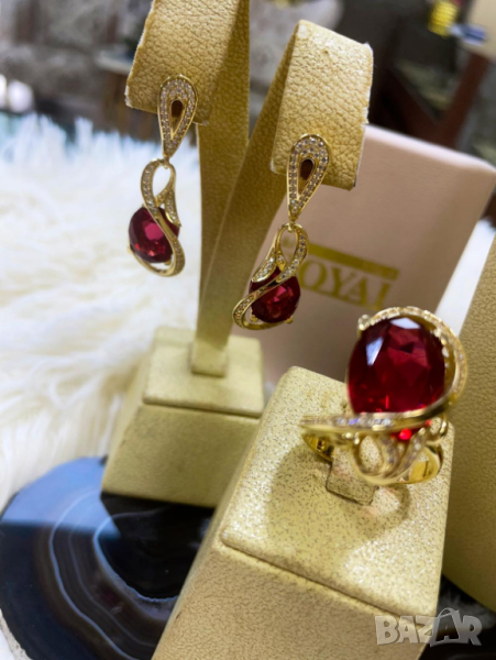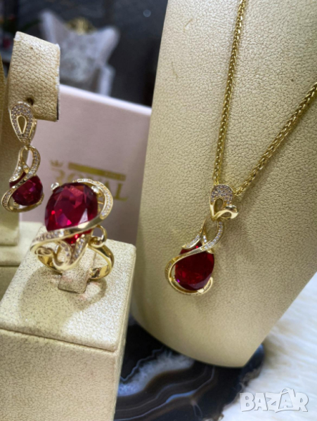 Нов бутиков италиански златен комплект с червени камъни.Диаметър на пръстена 19 мм.Текло на комплекта 25,06 грама.Синджира не се продава, цената е само за комплекта.