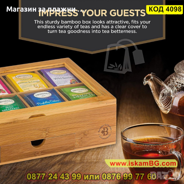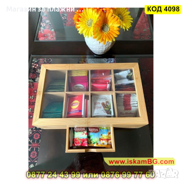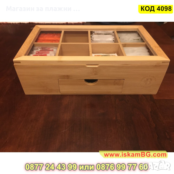 Кутия за съхранение на чай, която Ви представяме притежава 8 отделения и чекмедже, за по – голямо удобство и комфорт. Материалът, от който кутията за чай е направена е висококачествено бамбуково дърво. Кутията има и стъклен капак, както и малко чекмедже. В нея ще можете да съхраните естествения аромат и свойства на Вашите любими чайове. Бамбуковата кутия за съхранение на чай се отличава с просторност, защото притежава цели 8 отделения, където да подредите пакетчетата с чай. Елегантен аксесоар за всеки дом, както и перфектен подарък за ценителите на ароматен и качествен чай!
