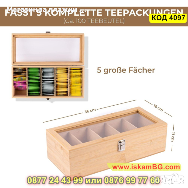 Кутията разполага с 5 отделения, които предоставят разделение и организация за различните видове чай. Капакът е изработен със стъклен прозорец, който позволява лесно да разглеждате съдържанието, без да е необходимо да я отваряте. Дизайнът от бамбук придава елегантен и естествен вид на кутията, която ще се впише хармонично във вашата кухня или чайната. Тази дървена кутия не само поддържа вашите чайове организирани, но и им придава стил и функционалност."