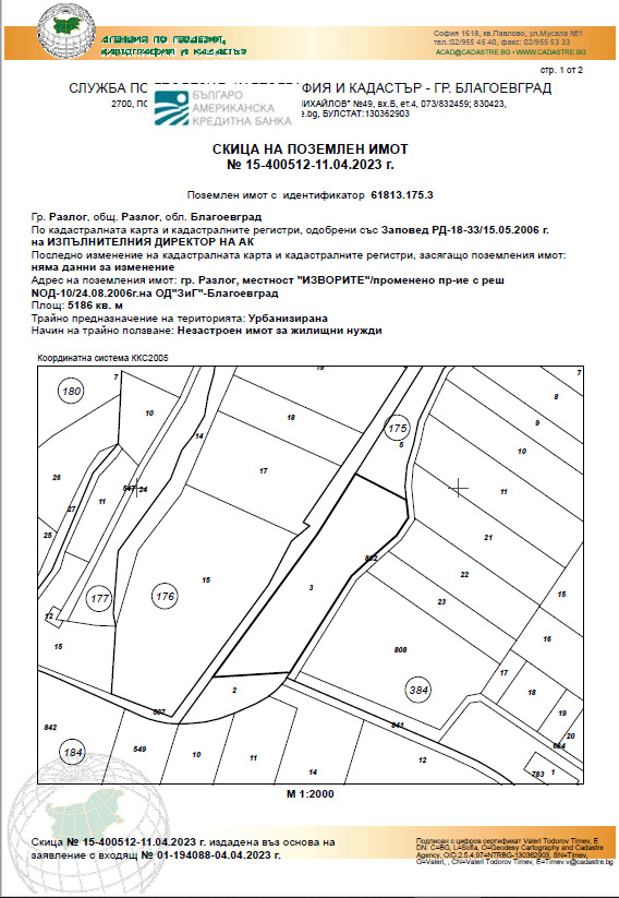 Поземлен имот 61813.175.3, област Благоевград, община Разлог, гр. Разлог, м. 'ИЗВОРИТЕ'/променено пр-ие с реш NОД-10/24.08.2006г.на ОД'ЗиГ'-Благоевград, вид собств. Частна, вид територия Урбанизирана, НТП Незастроен имот за жилищни нужди, площ 5186 кв. м, стар номер 175003,