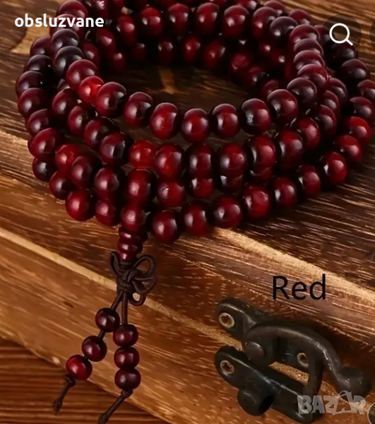 Състои се от 108 мъниста от червено сандалово дърво. С орнаменти.