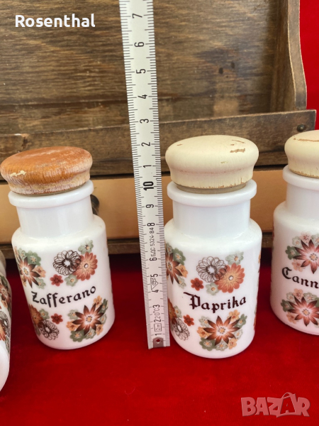 Бурканчетата са здрави от млечно стъкло. Предната летвичка на етажерката е лепена. Италиански са. Размерите са показани на снимки.