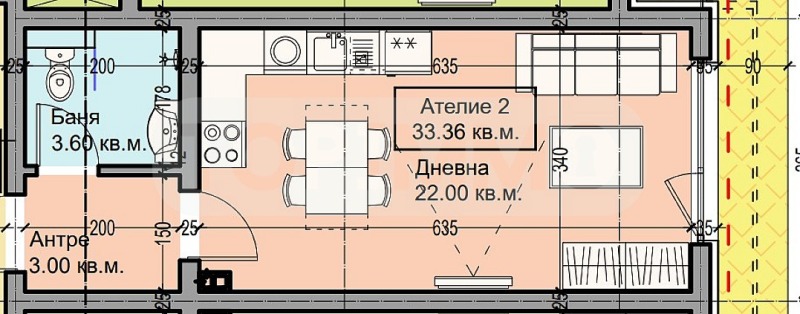 Имотът, който ви представяме е разположен на 1-ви етаж и е със следното разпределение: антре, всекидневна с кухненска част 22 кв.м. с излаз на веранда, санитарен възел. Прилежащо паркомясто към всеки апартамент, включено в цената.