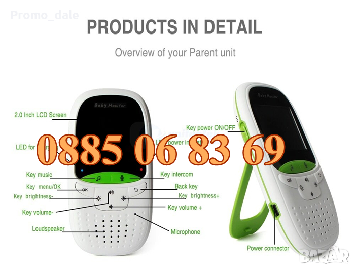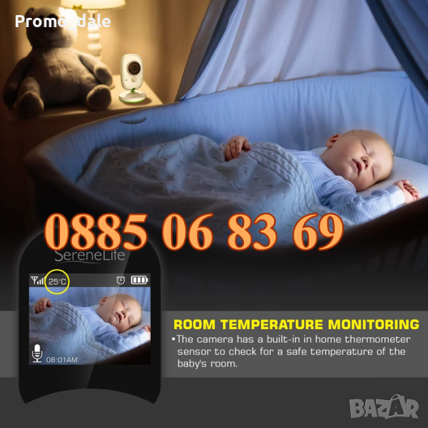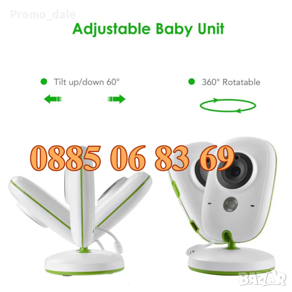 Този бебефон е практичен и полезен, за да може рационално да използваме времето, в което бебето спи. Безпроблемно преносимо наблюдение, идеално за апартаменти и къщи. Този модел е всичко, което Ви трябва за наблюдение на Вашето дете по всяко време, през деня и през нощта. Възможност за дистанционна работа до 200м., презареждащи се батерии, издържащ до 8 часа без зареждане. Вграден музикален плейър, с който може да пускате приспивни песни на детето.