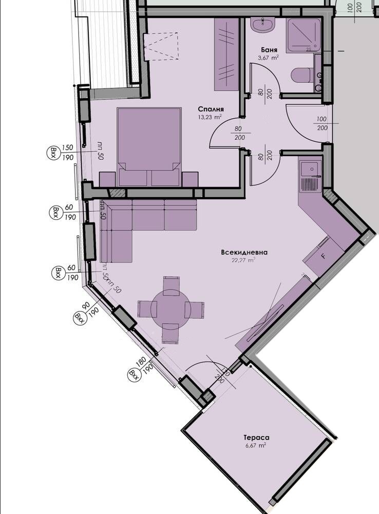 Оф.78343 Предлагаме Ви двустаен апартамент, в нова сграда в кв. Кършияка. ОФЕРТАТА СЕ ПРЕДЛАГА САМО ЗА КРАЙНИ КЛИЕНТИ! Очакваният срок за Акт 14 е края на 2024г. Жилището се намира на пети етаж и е с площ от 66 кв.м. Имотът има следното разпределение: