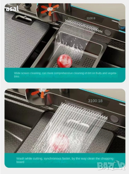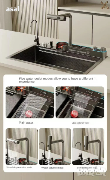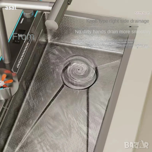 Чисто нова висококачествена мултифункционална мивка от неръждаема стомана. Създава многофункционално работно пространство, за да можете удобно да миете плодове и зеленчуци с нейнияуникален водопад и подходяща дренажна кошница. Единичната голяма купа осигурява достатъчно пространство за накисване и почистване на съдове за готвене, докато наклонената основа към единичния изместен дренаж минимизира натрупването на вода. Изработена е от неръждаема стомана с нано покритие, което я прави устойчива на отчупване, напукване или изгаряне, и осигурява години красота и надеждна работа.*** Предлагаме и филтърни системи за вода, както и мелници за хранителни отпадъци съвместими с мивката.Налични цветове:- Сив- Бял- Размери: 75см х 46см х 23см- Дисплей с индикация за температурата на водата и продължителността на използване- Бутони за включване и изключване на всяка една от функциите- Покритие устойчиво на вода и мазнини, позволяващо лесно почистване- Специална форма за оттичане на водата- Приставка за измиване на чаши с високо налягане- Смесител за филтърна вода *(предлагаме отделно и филтърни системи за вода)- Смесител за вода с 3 режима и издърпваща се глава- Два "водопада"- Селектор за контрол на оттичането- LED ПодсветкаКомплекта включва:- Мивка- Сифон с контролер- Тръби за отпадни води- Приставка за измиване на чаши с високо налягане- Смесител за филтърна вода *(предлагаме отделно и филтърни системи за вода)- Диспенсър за сапум или веро- Смесител за вода с 3 режима и издърпваща се глава- Малка тава- Триъгълна кошница за изплакване- Дъска за рязане- Меки връзки за топла и студена- Спирателни кранове за топла и студена вода*** Предлагаме и филтърни системи за вода, както и мелници за хранителни отпадъци съвместими с мивката.Изпращаме по Еконт.За поръчка ни трябват 2 имена, телефон и офис на Еконт.