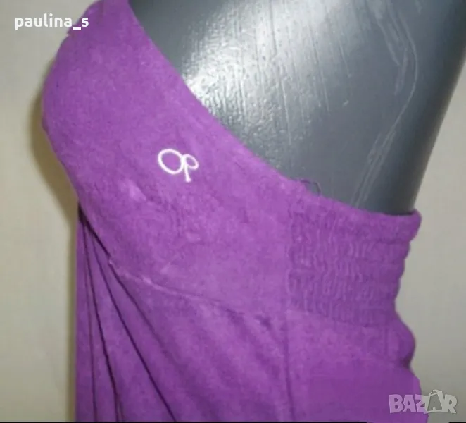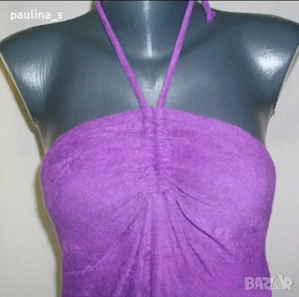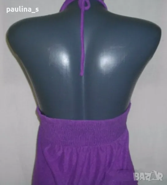 2. Колаж / M / 2XL - "Op dress". Цената е крайна 24,99лв. Рокля с бюстие и открити рамене, с волан. Люляково лилава рокля със средна презрамка, около врата. Материята е много еластично релефно трико в люляков Десен, пада тежко и стои отлично. Състав - район(кактусова коприна, памук и примеси). Моделът е с набор на бюста и завързване около врата, отзад се фиксира с ластични набори, с долу завършва с игрив волан.