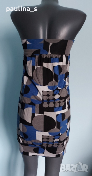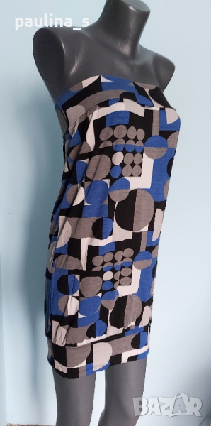 1. Колаж / M / 2XL - "Second female +". Френска рокля тип туника с открити рамене във футуристичен принт с турско синьо. Цената е крайна 19,99лв. Подмишниците фиксират, а надолу покрива торса. Много еластична от ликра и вискозна коприна, покрива няколко размера, посочени са. Без дефекти и етикет, една бройка е, като нова.