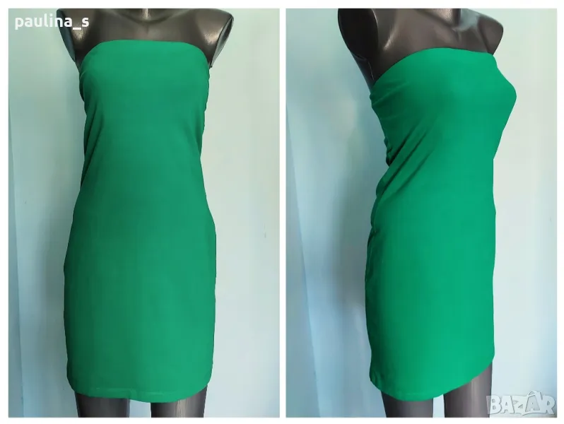 3. Колаж / L / 3XL - Еластична маркова рокля без презрамки и с вграден сутиен "H&M" basic. Цената е крайна 19,99лв. Еластична маркова рокля с гол гръб без презрамки и вграден сутиен в смарагдово зелено. Материята е памук и ликра - еластична и покрива няколко размера, хипоалергична. На нивото на бюста за да стои перфектно в страничните тегели има набор, сутиенът е с префектно прилепваща долна част. Без дефекти и етикет, като нова.