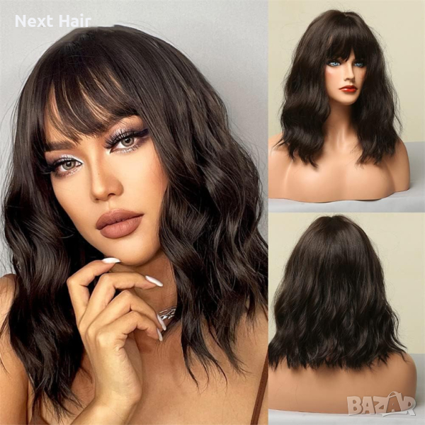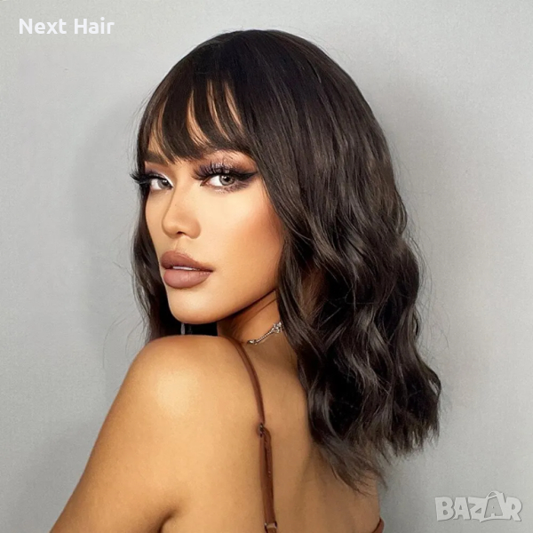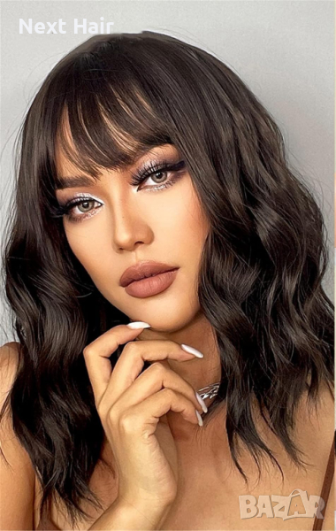 Тъмно кафява вълнообразна къса перука с бретон → Обява 44732047