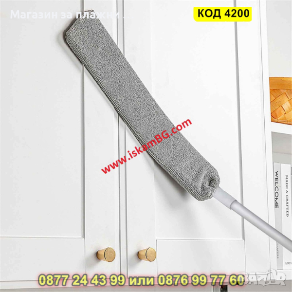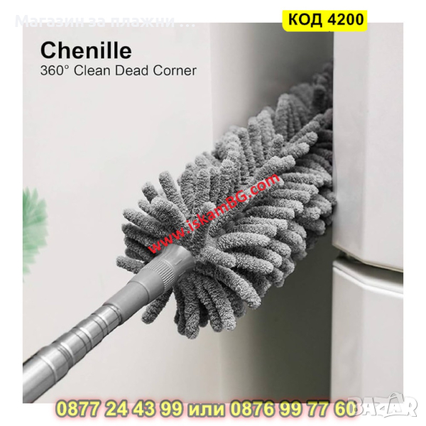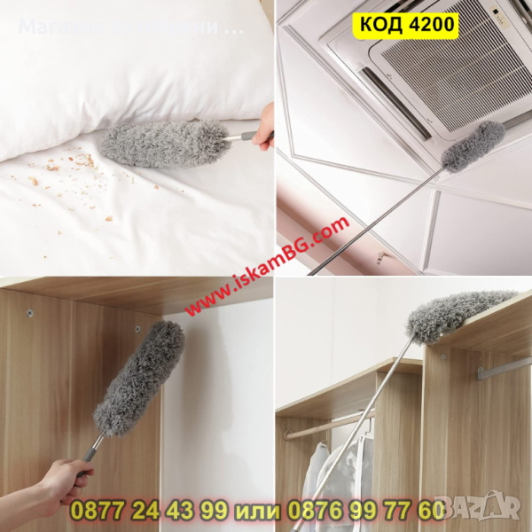 С този прахоуловител можете да достигнете всяко място, което изисква почистване, без много усилия! В сгънат вариант антистатична четка с дръжката е 83 см, а в разгънато до пълна дължина достига 256 см. По-интересното е, че не е нужно да разнасяте четката до максималния диапазон, а до дължината, която ви е необходима в момента. Метлата има два сменяеми върха. Надлъжният с подвижен почистващ препарат е предназначен за цепнатини и плоски повърхности. Благодарение на възможността за свободно огъване можете да бръкнете дори под хладилника. Има и кръгла четка, която ще отстрани старателно прах и паяжини зад гардероби, от тавана, от мебели и много други кътчета. А възможността да го огънете по всякакъв начин ще ви накара да достигнете и до най-недостъпните места.