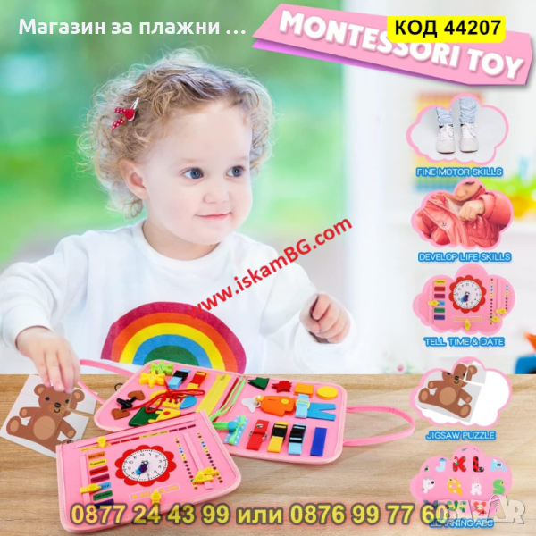 Чисто нов Busy board с които да започнете да развивате уменията на вашите деца в ранна детска възраст по метода Монтесори, според който обучението и възпитанието на децата трябва да започне преди 3-годишна възраст като най-общо този метод се случва без манипулиране на поведението чрез наказания и награди.