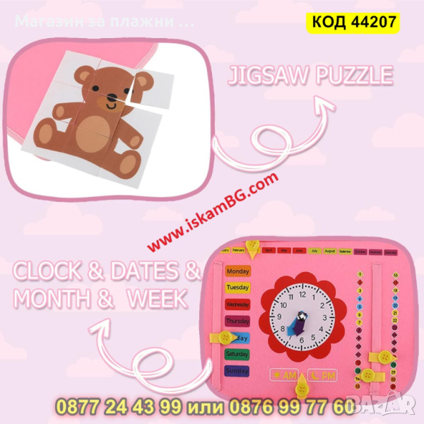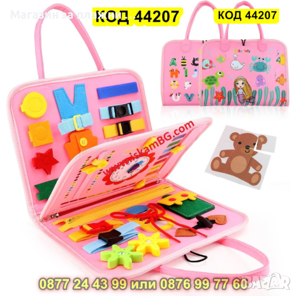 Бизиборд представлява сгъваема мека дъска с много различни дейности, предназначена да помогне на детето да експерементира и да придобие знания и умения чрез игра и забавления.