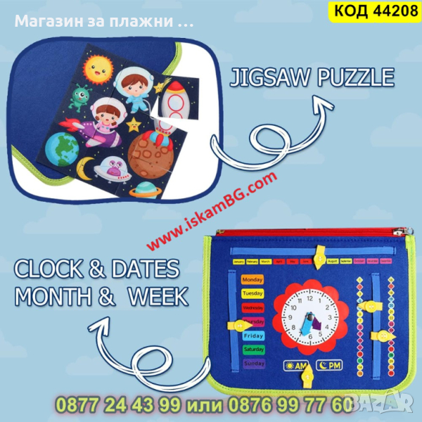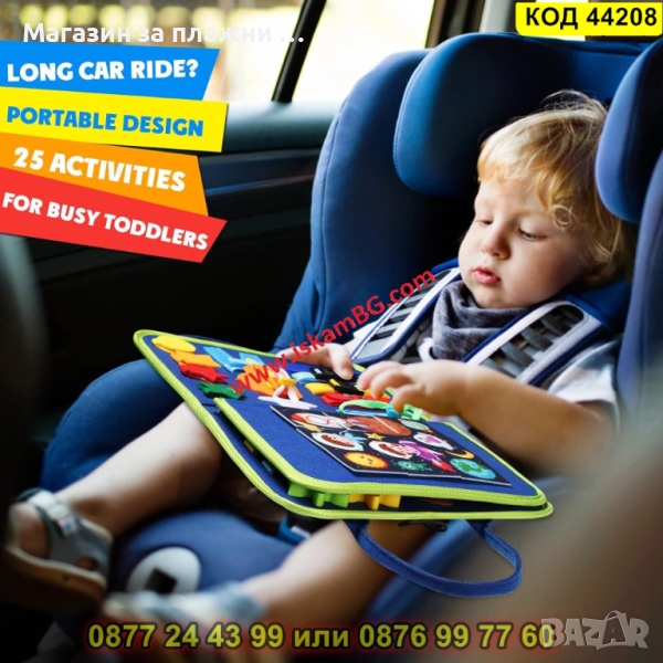 Нашата манипулационна бизи боард мека книжка е изработена от филц и се предлага под формата на чантичка. Тя е мека и приятна на допир. Нейната лекота и компактност означават, че тя ще бъде лесна за носене от детето ви и то ще може да я вземе със себе си, където пожелае.