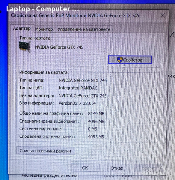 Видео Карта: Nvidia GeForce GTX 745 4GB обща графична памет 8GB