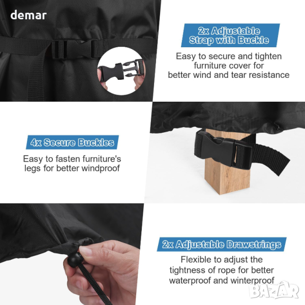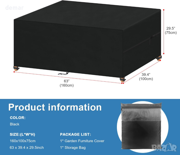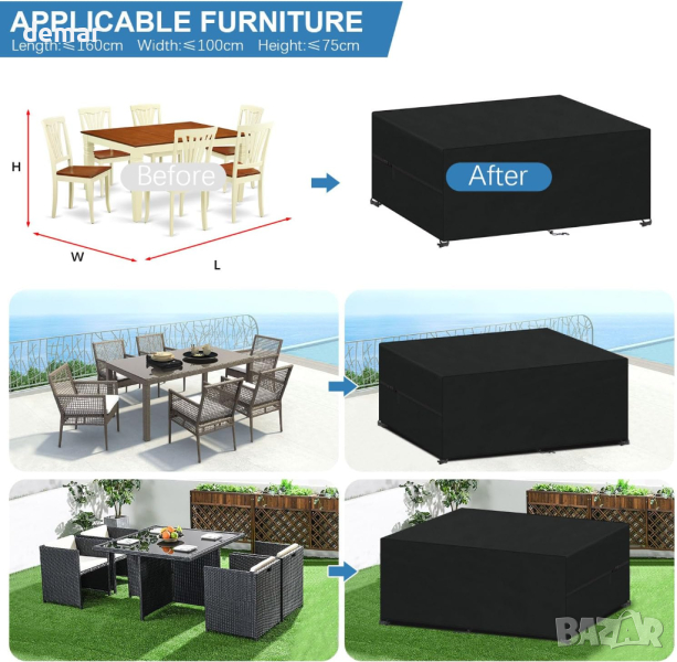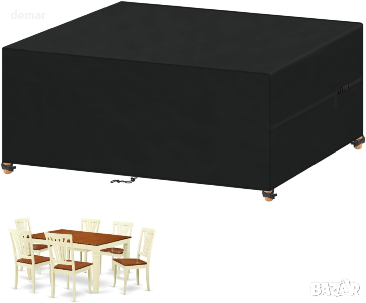 Тази покривка за градински мебели, изработена от здрав полиестер 420D Oxford, разполага с превъзходно PU покритие за несравнима хидроизолация, устойчивост на атмосферни влияния, прахоустойчивост, UV защита и устойчивост на разкъсване, превъзхождайки традиционните PVC покрития по издръжливост, устойчивост на топлина и комфорт. Проектиран за перфектно прилягане, той включва регулируеми каишки с катарама за плътно прилягане и естетичен вид. Подобрен с външни тръби, двоен шев и уникална водоустойчива лента по шевовете, той предлага изключителна устойчивост на атмосферни влияния и устойчивост на разкъсване. Закрепването става лесно с четири ремъка с щракване и два шнура, осигуряващи стабилност дори при силен вятър. Почистването е без усилие, изисква само вода и слънчева светлина или просто избърсване и се доставя с удобна чанта за съхранение. С размери 170x110x75 см или 160x100x75 см (ДxШxВ) това покритие е идеално за защита на широка гама мебели за вътрешни дворове, включително маси, столове, дивани и комплекти за хранене, като гарантира, че те ще останат сухи и запазени. Моля, измерете вашите мебели, преди да поръчате, за точно пасване.