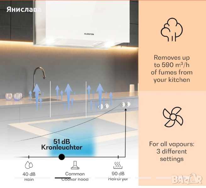 интегрирано бяло осветление над плочата за готвене при всички 3 нива на работа клас на енергийна ефективност А