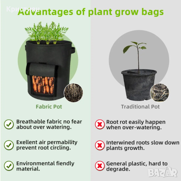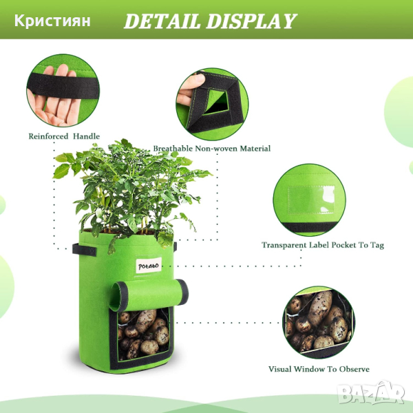Създадена от влагоустойчива и дишаща материя, торбата предоставя идеалните условия за растеж на зеленчуци. Това не само предпазва растенията от възможни проблеми, свързани с влагата, но и стимулира тяхното здравословно развитие.