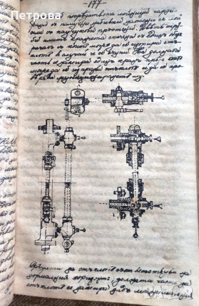 Притежавам по наследство това съкровище, този уникат на 117 години, РЪКОПИСНО техническо издание озаглавено "Парни машини", с много чертежи, схеми и подробни обяснения към тях от инж. Христов и инж. Радев, голям формат, издадено през 1907 година. Книжното тяло е ненакърнено, съхранено отлично. Охлузена е само задната корица. Цена 90 лв.