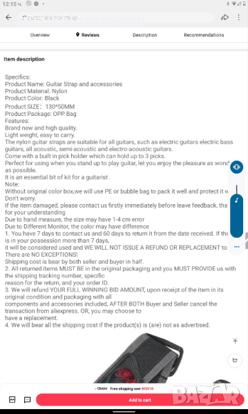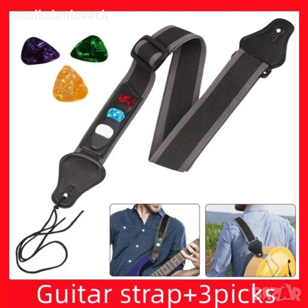 Колан за китара с кожени накрайници и място за перца /черно/ → Обява 44742229