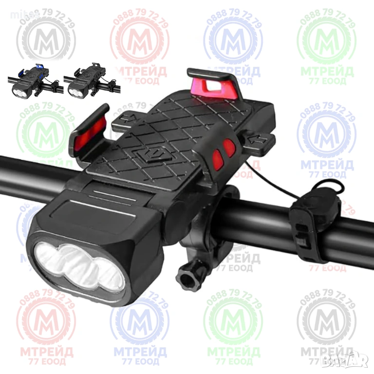 Иновативно и компактно решение, което консолидира четири ключови функции в едно устройство: мощен LED фар за осветление, силен електронен звънец, сигурна стойка за мобилен телефон и вградена външна батерия. Този мултифункционален аксесоар е проектиран да отговори на всички съвременни изисквания за безопасност, навигация и комуникация по време на колоездене, свеждайки до минимум броя на отделните компоненти, които трябва да монтирате на кормилото.