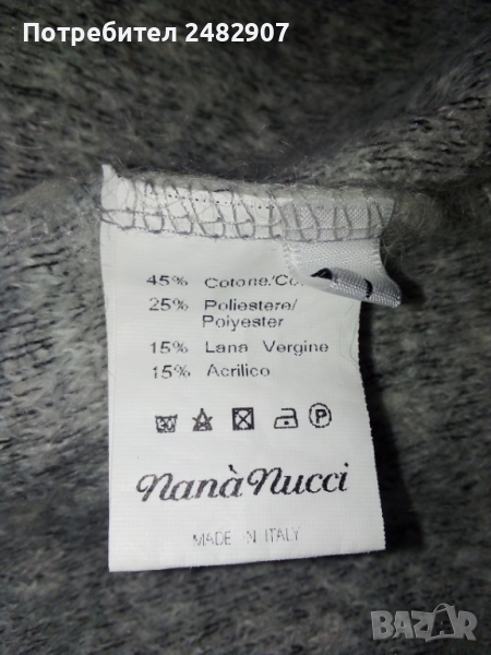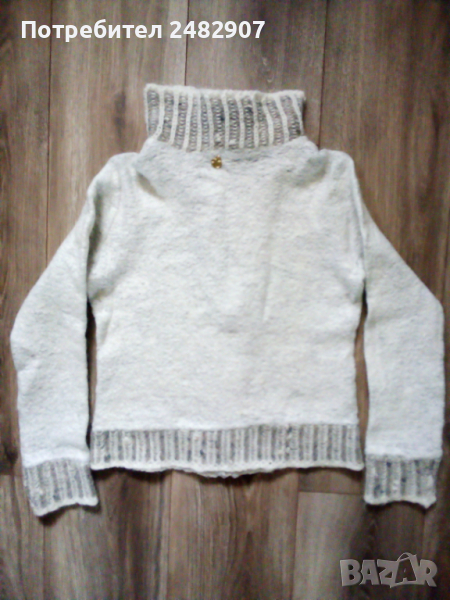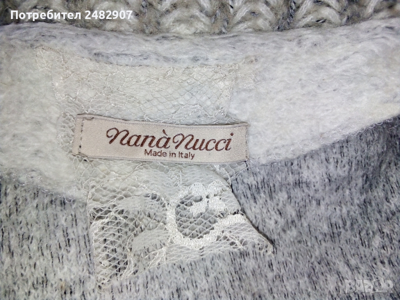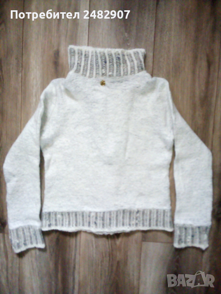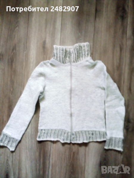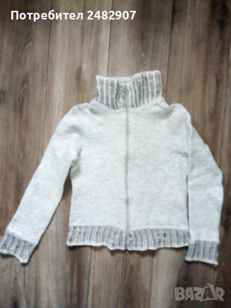 Детска сива жилетка за момиче. Съдържа 45 % памук, 25 % полиестер, 15 % лана и 15 % акрил. Ширина в раменете - 36 см, ширина под мишниците - 42 см, ширина в долната част - 41 см, дължина от рамото до долу - 49 см, дължина на ръкава от рамото - 55 см, ширина на ръкава в долната част - 10 см. Много запазена, почти не е използвана, закопчаване с цип, машинно плетена, с яка.