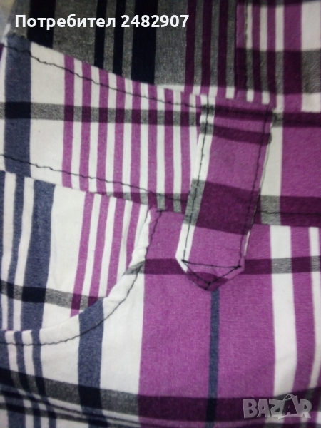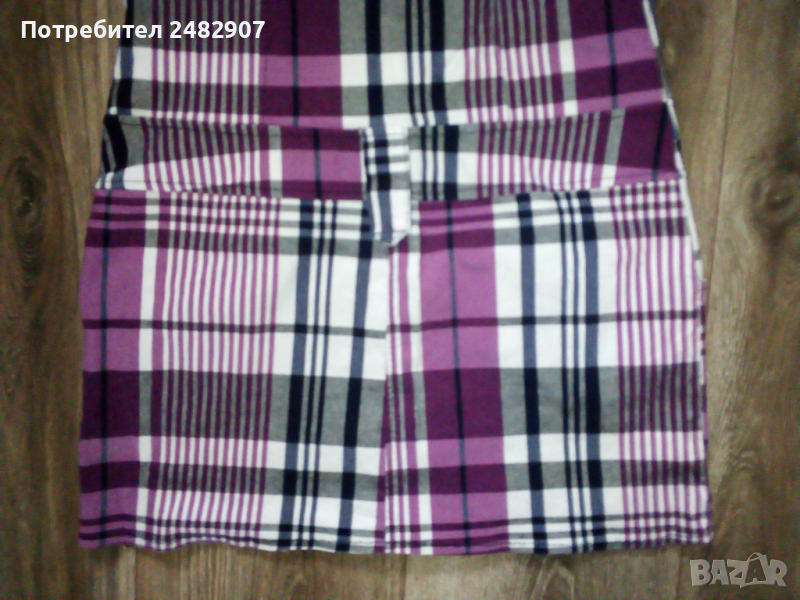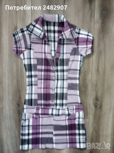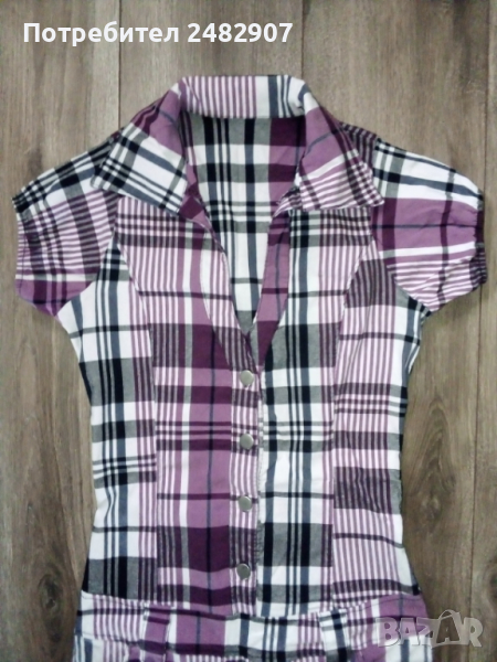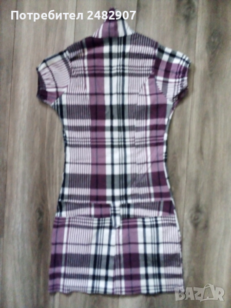 Дамска рокля - каре, с ниска талия в бяло, черно и лилаво. Ширина в раменете - 30 см, ширина под мишниците - 41 см, ширина в долната част - 46 см, дължина от рамото до долу - 83 см, дължина на ръкава от рамото - 12 см. Много запазена, почти не е използвана, с яка и два джоба отпред, закопчаване от талията до горе - с 4 бр. метални сиви копчета, еластична, с 3 бр. широки гайки на талията.