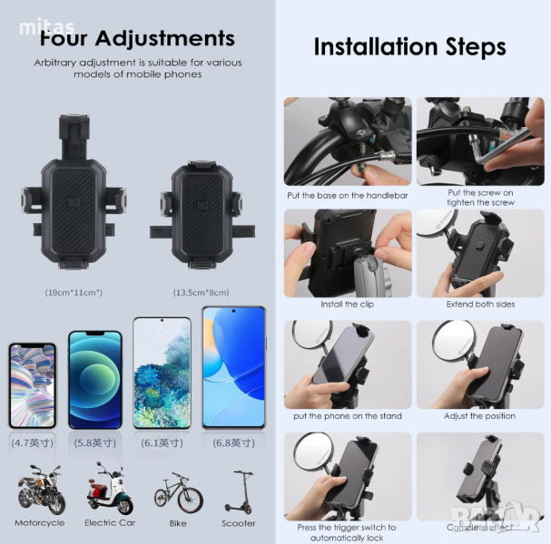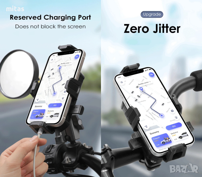 * Много стабилен монтаж, перфектно захващане на устройството без възможност за изплъзване и без вибрации. Заключващ се дизайн с един бутон, заобиколен от четири ъгъла, много удобен и стабилен. 4-те ъгъла са оборудвани със силиконови подложки, които не се плъзгат, удароустойчиви и не надраскват.