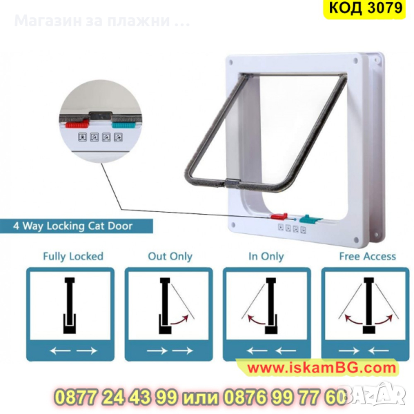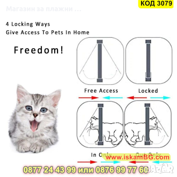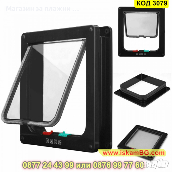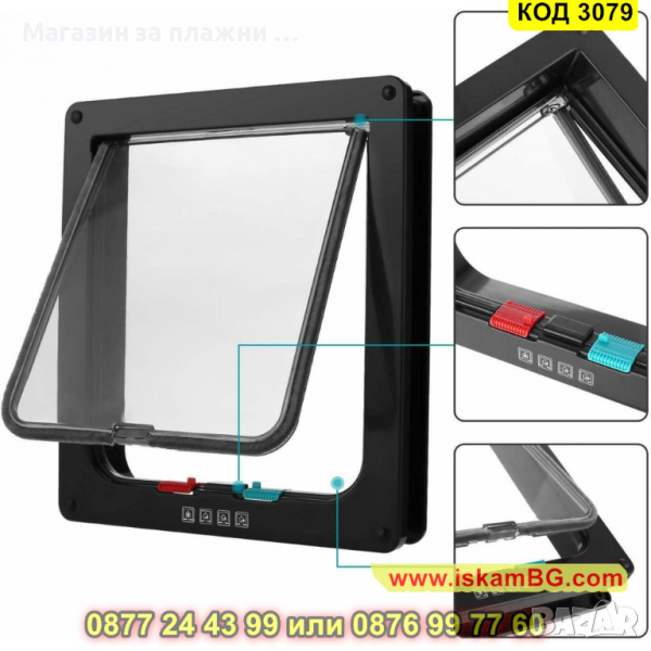 Вратичка за домашни животни, може да се инсталира на дървени и стъклени врати, както и на стени. Със специална система за отваряне по 4 начина: влизане и излизане, само влизане, само излизане и напълно затворено. Тя е оборудвана със сигурна ключалка с 4 опции на отваряне, а благодарение на уплътнението и магнитната заключалка е устойчива на атмосферни влияния, предпазва от течение и е безшумна при отваряне и затваряне.