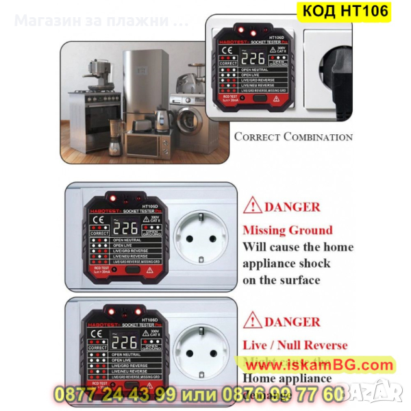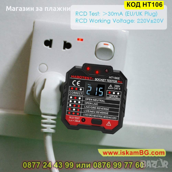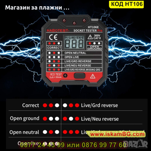 Тестерът за контакти от Habotest ще ви помогне да се погрижите за безопасността на дома си. Това малко и практично устройство разполага с цифров дисплей и LED индикатор, които ще ви предоставят най-важната информация. Ще ви информира за липсата на заземяване и ще ви позволи да извършите RCD тест. Тестерът е оборудван с ярък дигитален дисплей, с който можете лесно да четете резултатите от измерването. Светодиодният индикатор, разположен в горната част на устройството, ще ви информира за евентуални проблеми. Ако тестерът открие някаква нередност, светодиодите ще светнат в определена комбинация. По този начин бързо ще разберете дали има повредата, дали е правилна връзката, дали липса заземяване, дали има проводник под напрежение и т.н. Устройството се отличава с многостранното си приложение. Ще ви бъде полезен за тестването на контакти у дома или офиса, на разклонители, на стенни контакти в училище, лаборатория или фабрика, както и за много други. Благодарение на компактния си дизайн, можете лесно да го съхранявате в чантата или раницата си. Характеризира се и с висока точност, ще получите удобен достъп до най-важната информация.