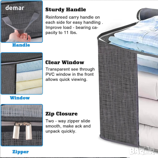 Тези модернизирани нетъкани чанти за съхранение разполагат с подсилени дръжки за лесно транспортиране, което ги прави идеални за преместване и организиране. Изработени от три слоя здрав нетъкан текстил, тези чанти могат да издържат до 20 килограма, подходящи за съхранение на всичко - от дрехи до книги. Гладките, издръжливи ципове № 5 осигуряват безпроблемно и дълготрайно затваряне. Налични в размер 35L, те отговарят на всички нужди за съхранение, независимо дали за компактни пространства или по-големи площи. Стилният дизайн включва големи ясни прозорци за бърза идентификация на съдържанието, съчетавайки елегантност с практичност във вашите решения за съхранение.