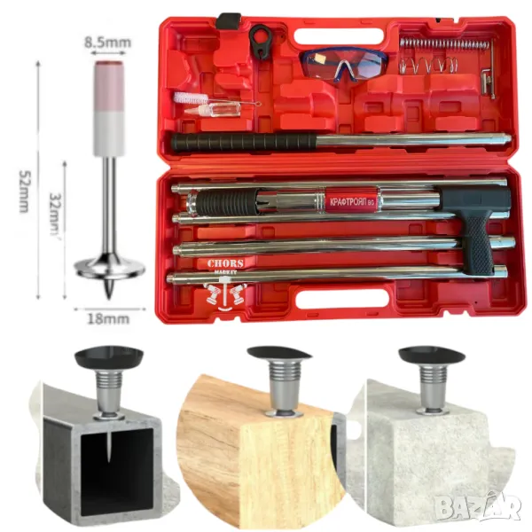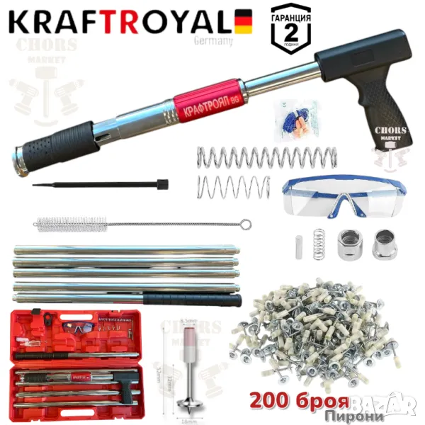 Пистолет за Пирони KRAFT ROYAL с 200 Броя Пирони в Комплекта инструмент, който представя най-високо качество и функционалност за всички нужди свързани с пирониране.