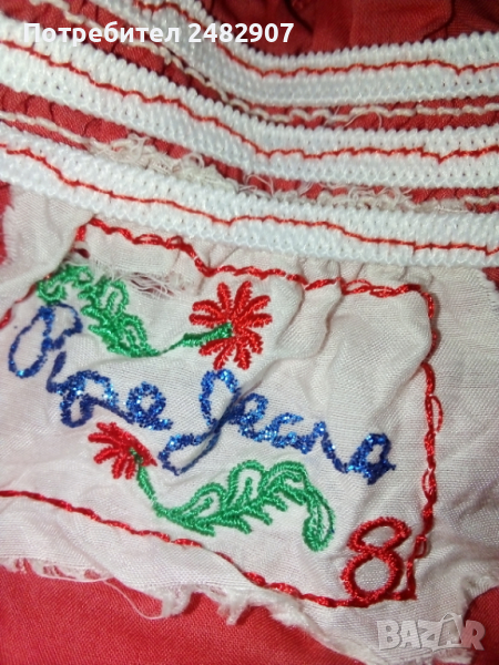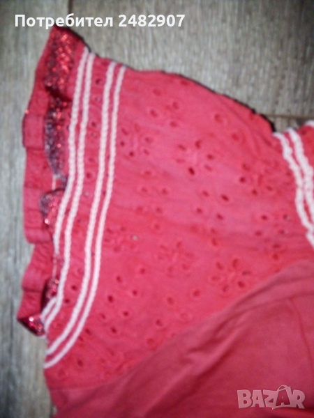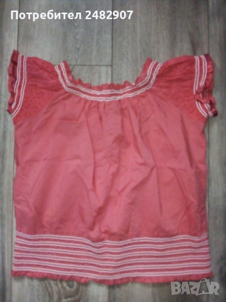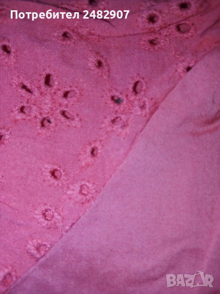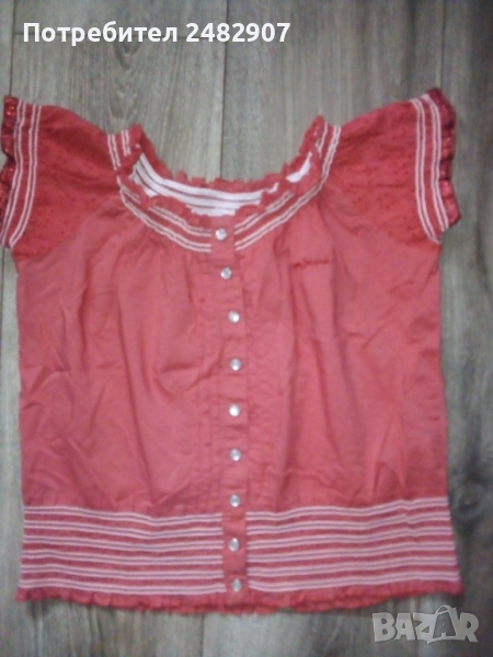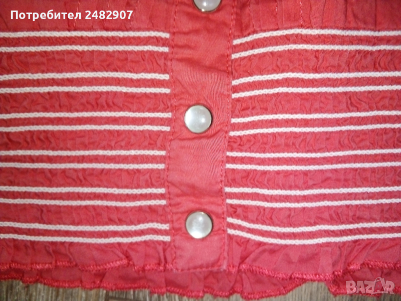Късо дамско елече от много фин тънък плат, цвят корал. Ширина под мишниците и в долната част - 40 см, дължина от рамото до долу - 42 см. Много запазено, почти не е използвано, закопчаване - с 9 броя тик-так малки копчета с перлен ефект.