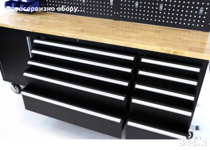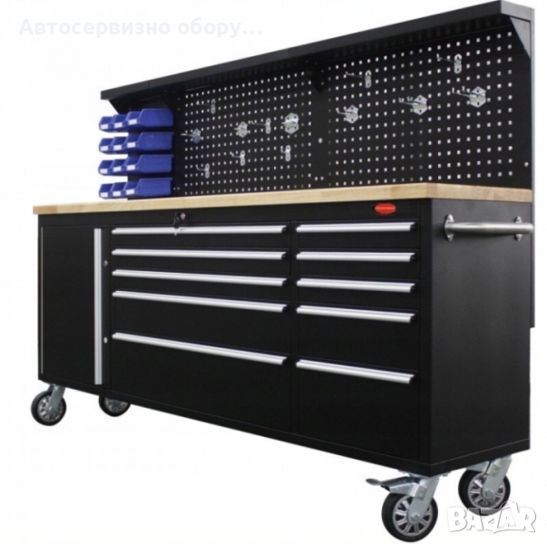 Количката разполага с шкаф и 10 чекмеджета (празни) , различни по размер. Има и удобен работен плот и място за закачкали за инструменти.