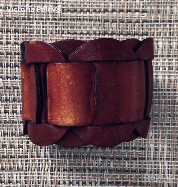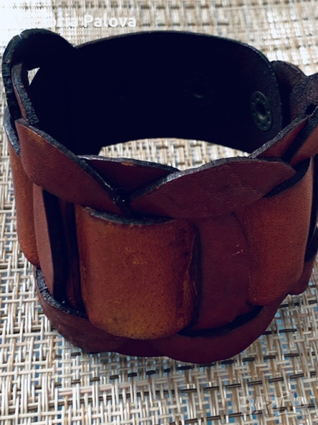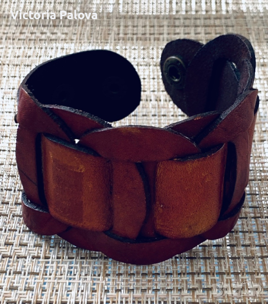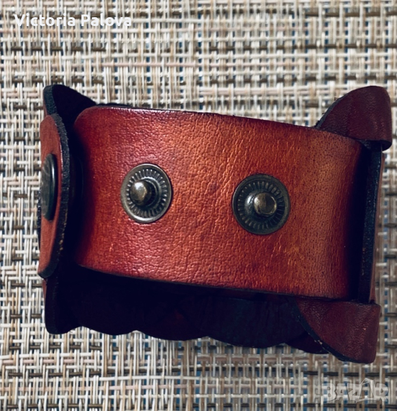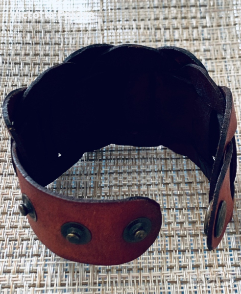Гривната е от естествена кожа, широка, с три позиции на закопчаване ( копчета тик-так) според размера на китката ( приляга плътно и органично на ръката), стои много красиво, и най-важното е, че подчертава индивидуалността на притежателката си, защото е уникат, единствен екземпляр.
