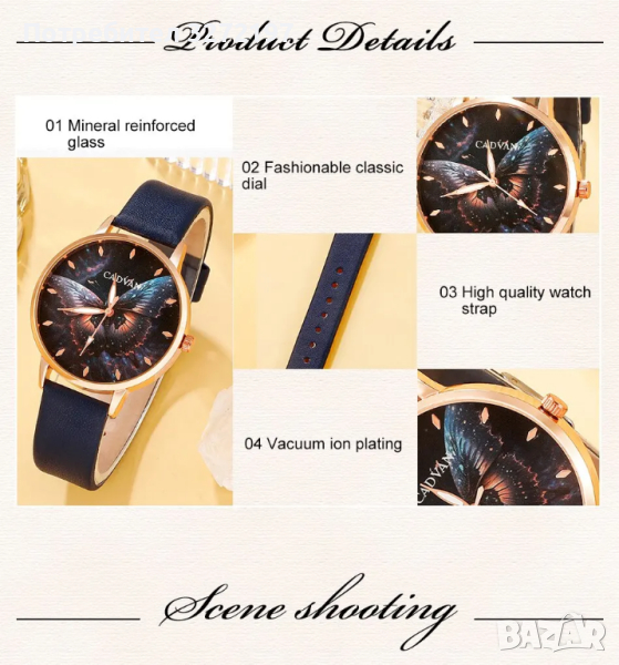 • Моден дизайн: Дизайнът на пеперуда и кожената каишка правят този часовник стилен аксесоар за всяко облекло.