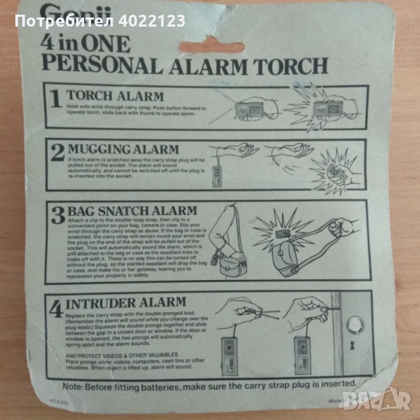 Аларма-фенерче 4 в 1 (за ръка , за чанта , за врата и фенерче) , чисто нова . Внос от Англия . Работи с 2 броя батерии (не са включени в комплекта).
