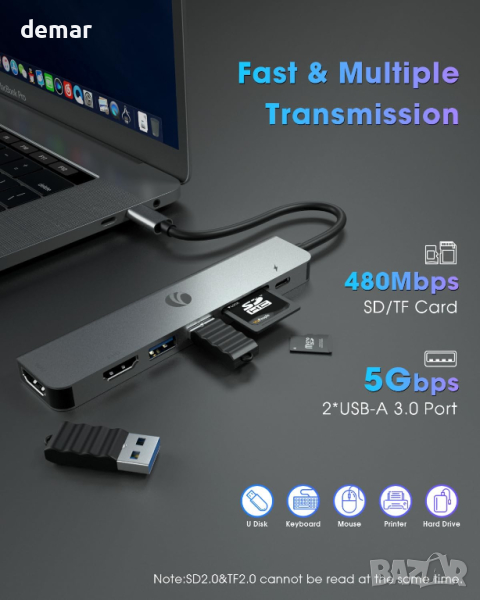 Подобрете изживяването на вашия лаптоп с VCOM 7-в-1 двоен мониторен хъб, включващ 4K@60Hz HDMI порт, 1080P@60Hz HDMI порт, 100W PD порт за зареждане, два USB 3.0 порта (до 5Gbps) и TF 2.0 /SD 2.0 слотове за карти. Този хъб поддържа MST (Multi-Stream Transport) функция за Windows и Mac OS системи, което позволява лесна настройка на двоен монитор с опции за огледало или разширен дисплей. USB 3.0 портовете предлагат бързо синхронизиране на данни при 5Gbps, с обратна съвместимост с USB 2.0, докато вградените SD и TF слотове осигуряват удобен достъп до карти с памет. Портът за зареждане 100 W PD осигурява непрекъснато захранване на вашите устройства. Насладете се на потапящи 4K@60Hz HDMI визуализации за изживяване при гледане с висока разделителна способност.