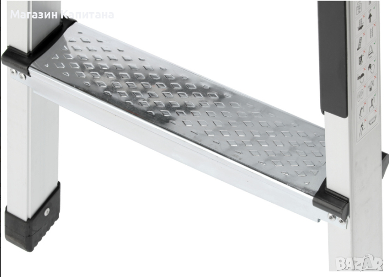 Сгъваема работна платформа от алуминиеви профили. За безопасност при използване платформата е покрита с противоплъзгащи ленти, а стъпалата са релефни. Големите заключващи ключалки осигуряват лесно разгъване.