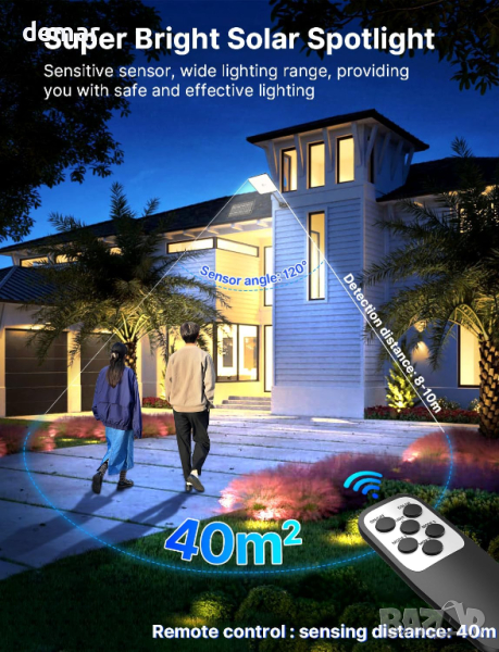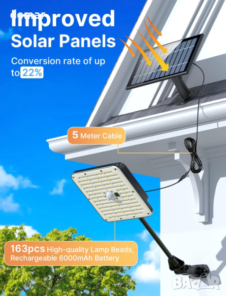 Mexllex 163LED охранителна лампа с отделен соларен панел, сензор за движение, USB,IP65, дистанционно