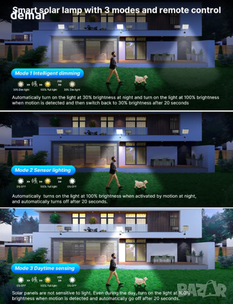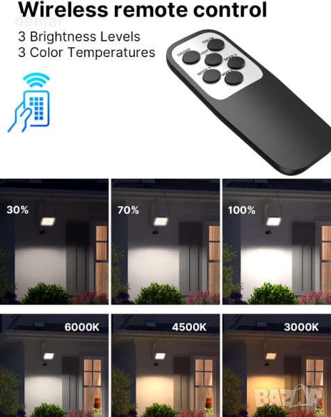 Изпитайте непрекъснато осветление с външно LED осветление за сигурност, включващо 6000mAh акумулаторна батерия, предлагаща 8 часа непрекъсната употреба след само 6 часа бързо зареждане. USB кабелът за зареждане осигурява захранване дори при облачно време. Персонализирайте осветлението си с три цветни температури и регулируеми нива на яркост, лесно управлявани чрез дистанционно. С рейтинг IP65 за устойчивост на атмосферни влияния, той издържа на дъжд или блясък. Три режима за засичане на движение осигуряват персонализирани нива на яркост за енергийна ефективност и сигурност. Опциите за инсталиране без усилие включват монтиране на стена или използване на куки за гъвкаво поставяне. Забележка: Когато соларният панел засече светлина или е свързан към източник на захранване, той автоматично влиза в режим на зареждане и светлината не свети. Покриването на соларния панел е необходимо, за да работи светлината нормално.