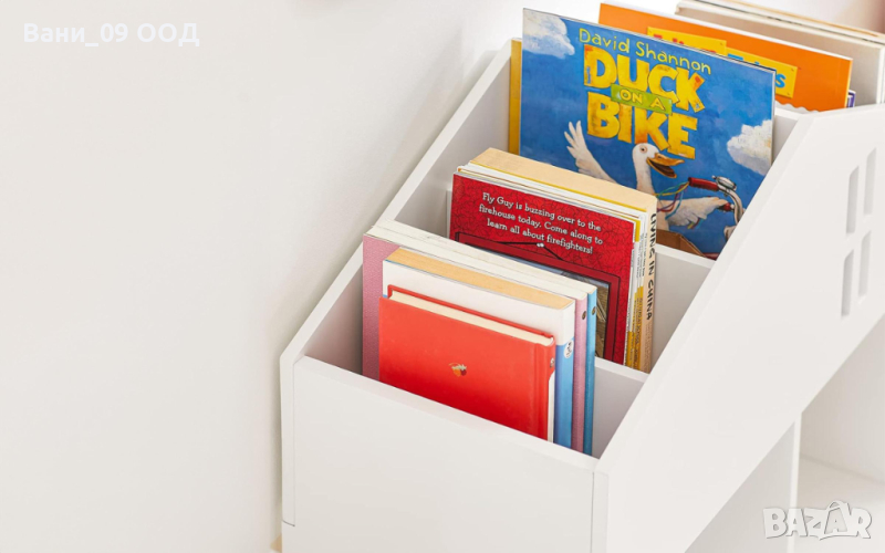 Мултифункционална детска етажерка "Къщичка" с рафтове за книги в горната част и 4 етажерки за играчки и принадлежности, 2 от които открити и 2 с текстилни кутии в свежи цветове