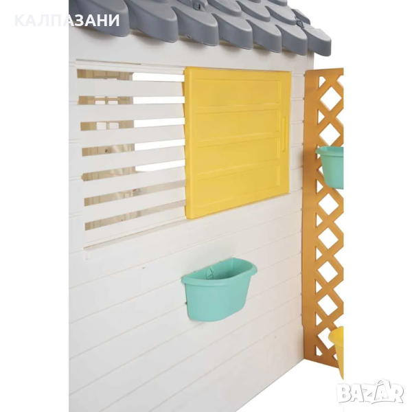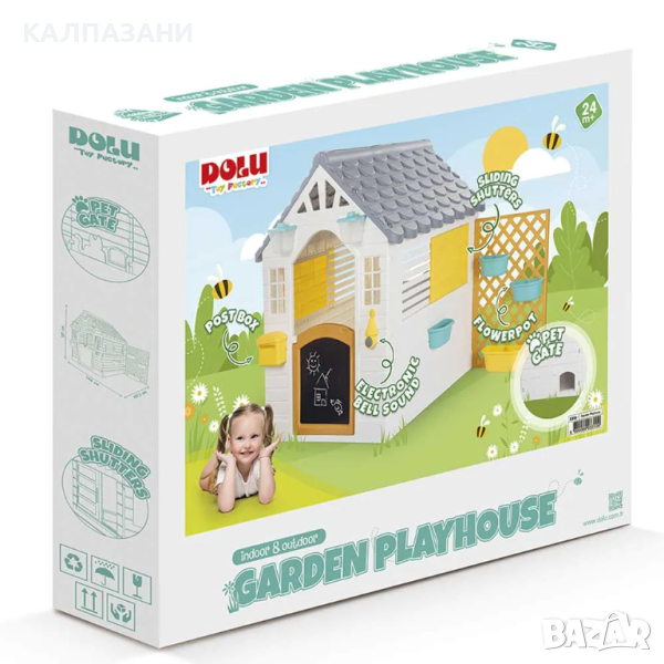 Идеалната градинска къща. Идва с плъзгащи се щори за предпазване от слънцето. Включени са пощенска кутия, саксии и звук на елекронен звънец, както и малка вратичка за домашния ти любимец. Подходящ избор за игра навън.