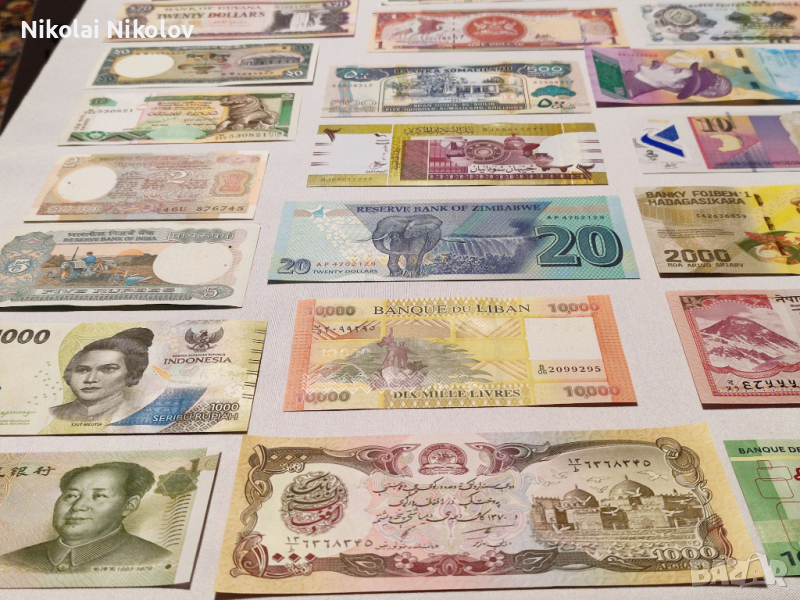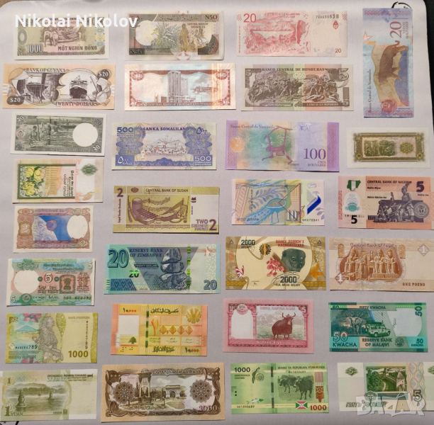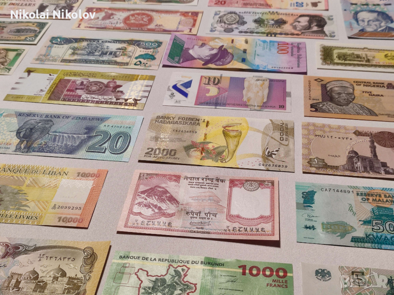 Лотът включва чисто нови, непрегъвани (UNC) банкноти от различни държави и континенти! Всички са в перфектно колекционерско състояние! Включени са екзточини държави като: Тринидад и Тобаго, Мадагаскар, Бангладеш, Непал и т.н..